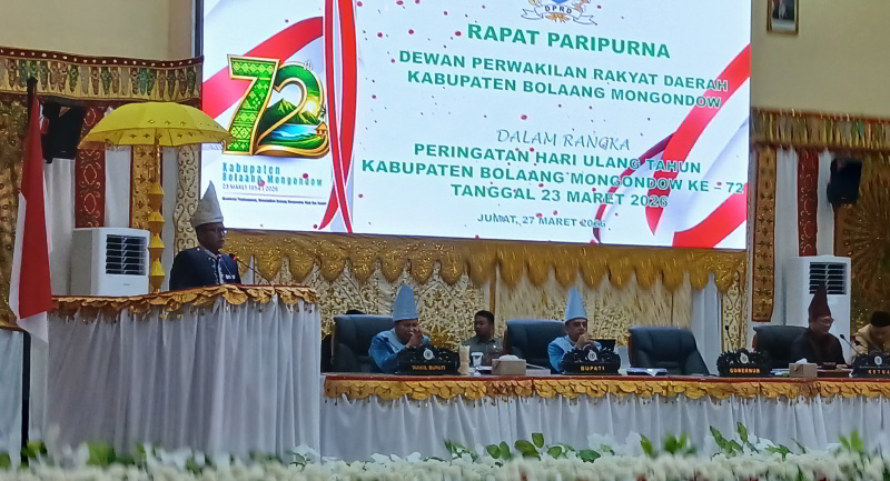 TOTABUAN.CO BOLMONG– Kabupaten Bolaang Mongondow (Bolmong), Sulawesi Utara, merayakan hari jadi yang ke-72 yang jatuh pada 23 Maret 2026. Acara puncak berupa Rapat Paripurna DPRD digelar pada Jumat (27/3/2026) di Ruang Rapat Paripurna Kantor DPRD Bolmong, dengan menghadirkan berbagai tokoh dan pemimpin daerah, termasuk Gubernur Sulawesi Utara Mayjen TNI (Purn) Yulius Selvanus, SE yang diwakili Kadis Koperasi dan UKM Tahlis Gallang.