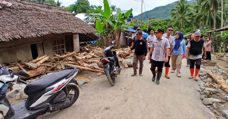Di tengah suasana duka itu, Bupati Bolaang Mongondow, Yusra Alhabsyi, datang meninjau langsung lokasi bencana. Dengan sepatu bot dan pakaian sederhana, ia berjalan di antara puing-puing kayu dan bebatuan, menyapa warga yang masih membersihkan rumah mereka.