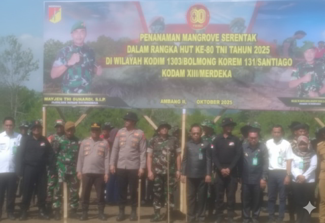 TOTABUAN.CO BOLMONG– Dalam rangka memperingati Hari Ulang Tahun (HUT) ke-80 Tentara Nasional Indonesia (TNI), Pemerintah Kabupaten Bolaang Mongondow (Bolmong) bersama Kodim 1303 Bolmong melaksanakan kegiatan penanaman mangrove di Desa Ambang, Rabu (01/10/2025).