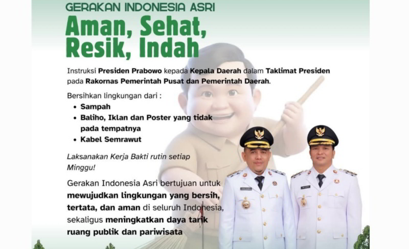 TOTABUAN.CO BOLMONG — Pemkab Bolaang Mongondow (Bolmong) menyatakan dukungan penuh terhadap Gerakan Indonesia Asri (Aman, Sehat, Resik, Indah) sebagaimana instruksi Presiden Prabowo Subianto kepada seluruh kepala daerah. Intruksi itu dalam Taklimat Presiden pada Rapat Koordinasi Nasional pemerintah pusat dan pemerintah daerah.