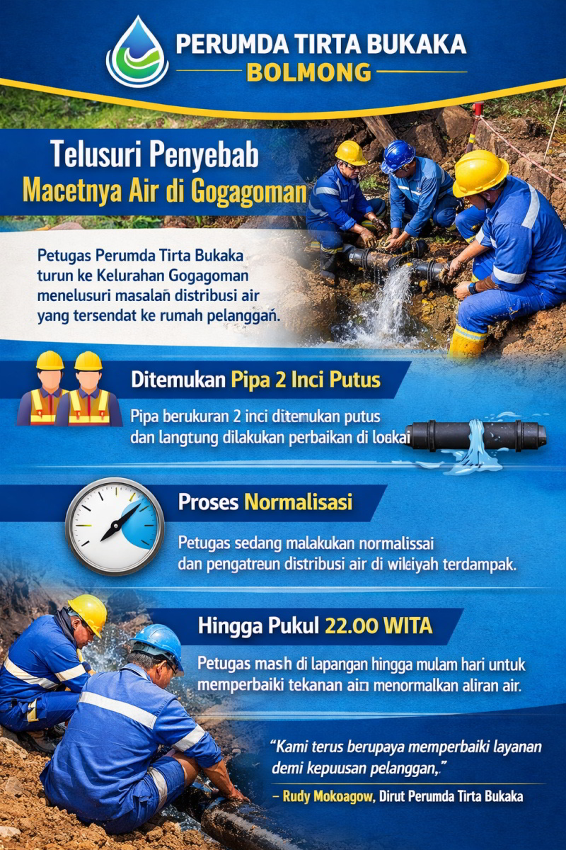 Saat ini, petugas masih melakukan proses normalisasi tekanan air di wilayah Gogagoman. Menurut manajemen, perbaikan dan pengaturan distribusi air membutuhkan waktu karena harus melalui tahap identifikasi lanjutan guna memastikan penanganan dilakukan secara tepat dan menyeluruh.