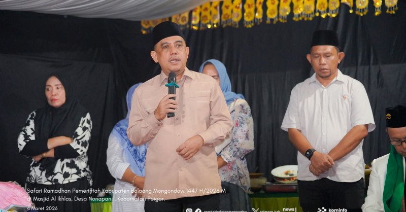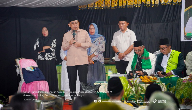 TOTABUAN.CO BOLMONG — Pemerintah Kabupaten Bolaang Mongondow (Bolmong) kembali melaksanakan agenda tahunan Safari Ramadhan 1447 Hijriah yang kali ini dipusatkan di Masjid Al Ikhlas, Desa Nonapan I, Kecamatan Poigar, Senin (9/3/2026).